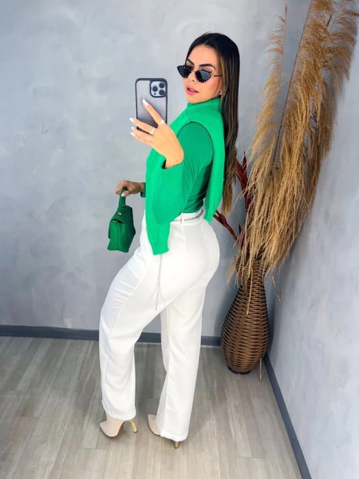 A Calça Pantalonade Alfaiataria é confeccionada em tecido de alfaiataria, entregando um caimento único.A calça possui detalhes que a tornam única, como lapelas e bolso faca frontal. Na parte traseira possui pences, com o objetivo de valorizar e realçar a silhueta e botões encapados. Por ser branca, possui leve transparência.A calça tem cintura com passantes para cinto e fecho por zíper e botão encapado e detalhe prata.Detalhes: Bolso Faca, Nervura na Frente, botão encapadoTecido: AlfaiatariaComposição: 98% Poliéster 2% ElastanoTemos P, M, G.Medidas do produto, veja a seguir:P - Comprimento 109cm; Cintura 72 a 76 cm; Quadril 100 a 106cm.M - Comprimento 110cm; Cintura 76 a 80cm; Quadril 106 a 110cm.G - Comprimento 111cm; Cintura 80 a 84cm; Quadril 110 a 114cm.*A cor do produto pode sofrer variação de acordo com a tela do celular/monitor.Composição: 98% Poliéster, 2% Elastano.